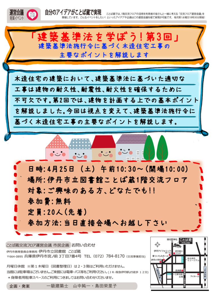 3. 【申込不要・先着20名】4月25日㈯伊丹市立図書館 ことば蔵で「建築基準法を学ぼう!第3回」のイベントを行います!