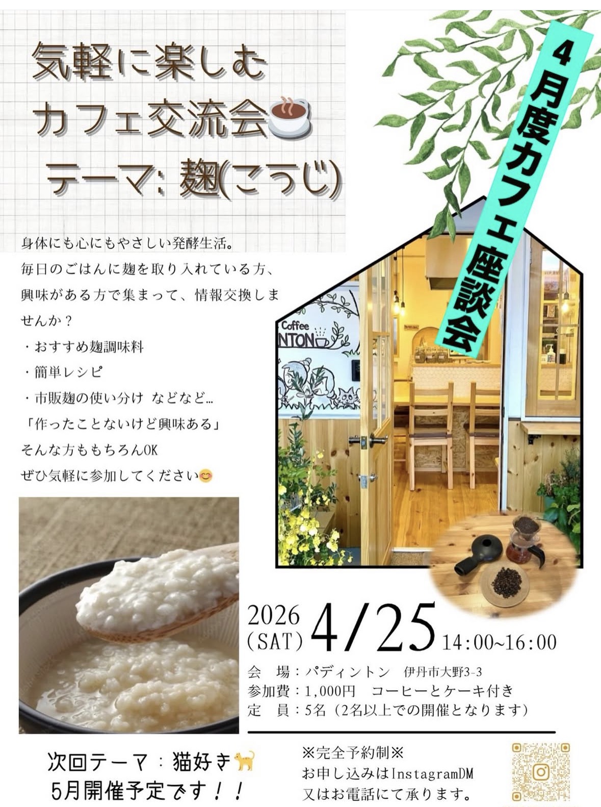4月度カフェ交流会「麹」4月25日開催!!詳しくはInstagramまで☕